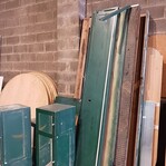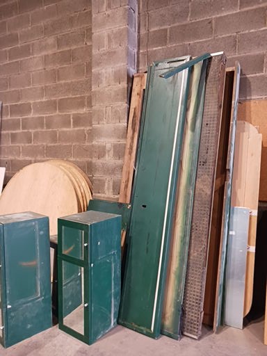 Piezas de madera restantes de la extracción del mobiliario de un hotel. Mesas redondas de sobremesa (60) y piezas sueltas de armarios, enceras, entre otros.