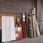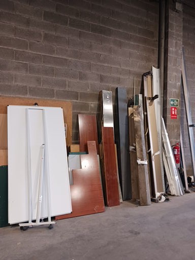 Piezas de madera restantes de la extracción del mobiliario de un hotel. Mesas redondas de sobremesa (60) y piezas sueltas de armarios, enceras, entre otros.